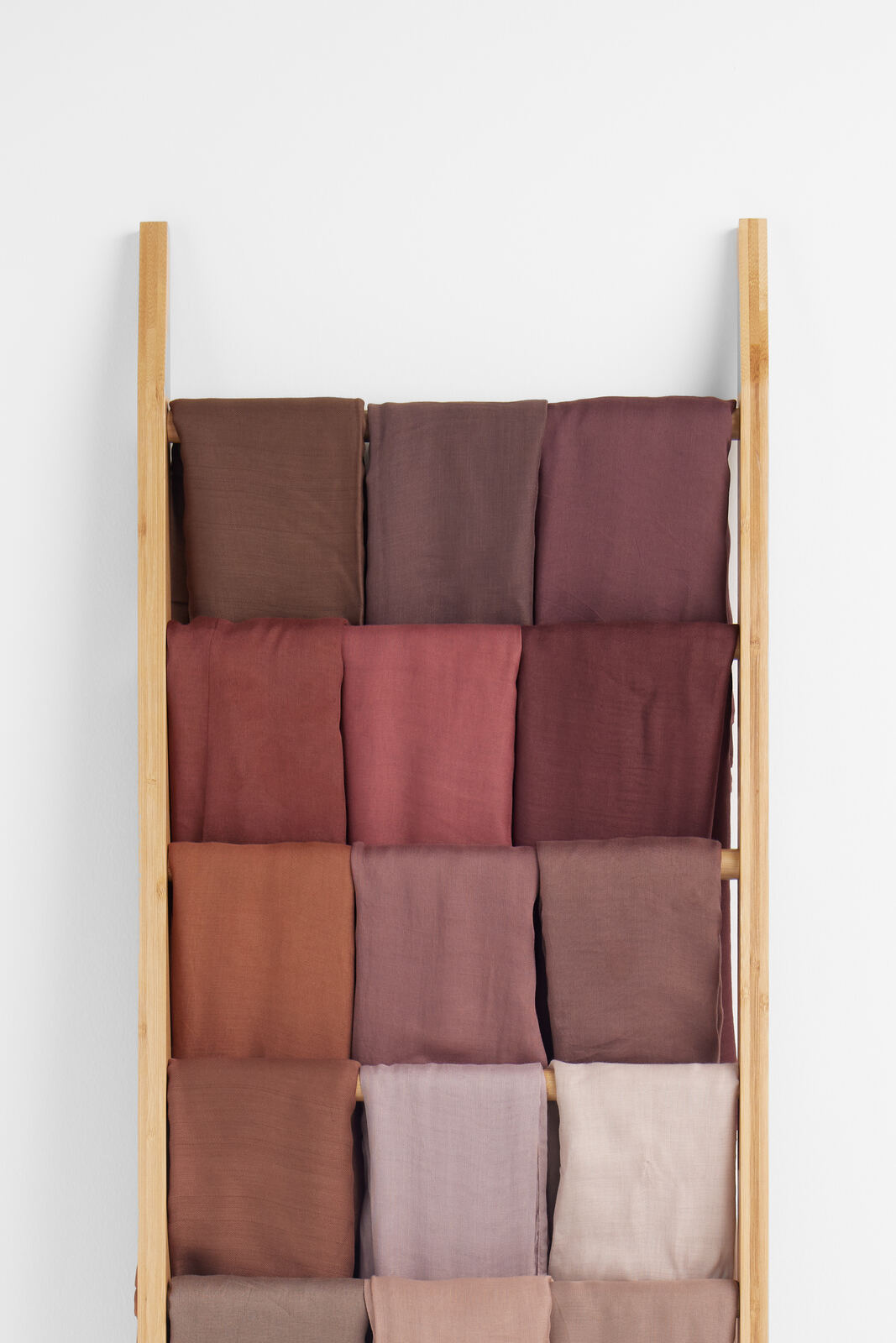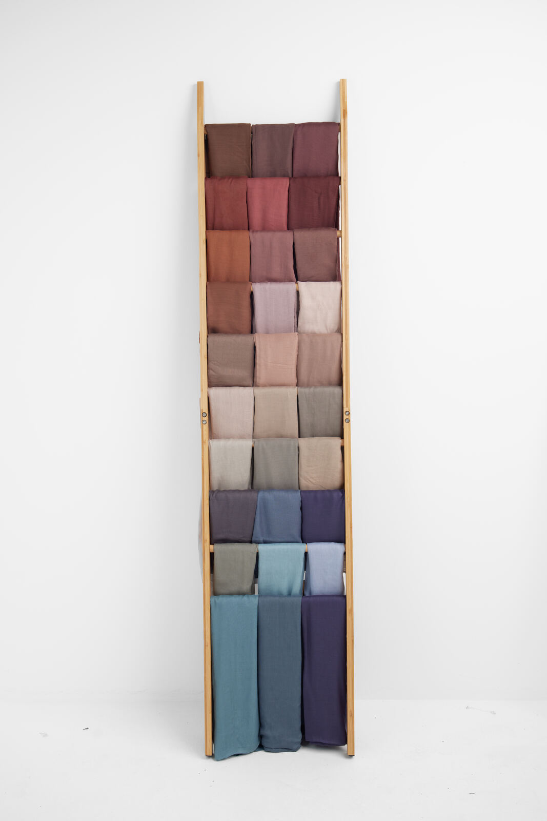 Introducing the Bamboo Hijab Ladder by Hijab House, an innovative project aimed at empowering women through sustainable hijab fashion and self-expression. Crafted from 100% bamboo wood, this Hijab Ladder boasts 10 rows, providing ample storage for approximately 30 folded hijabs. Each row is idesigned to securely hold your hijabs in place, preventing them from slipping or tangling. It allows you to neatly organize your hijabs by colour, style, or occasion, simplifying the process of selecting the perfect one for any outfit. Its compact design fits perfectly behind a door or can lean against any wall effortlessly, featuring rubber grips on the legs for added stability.