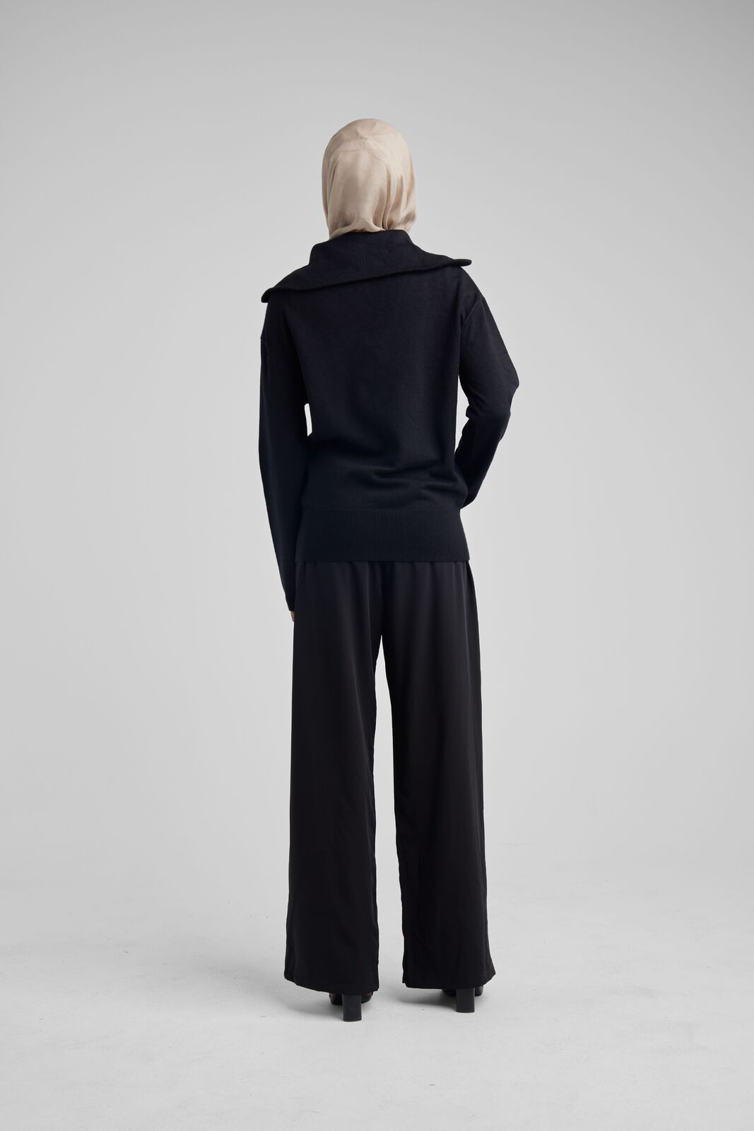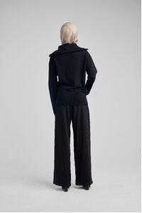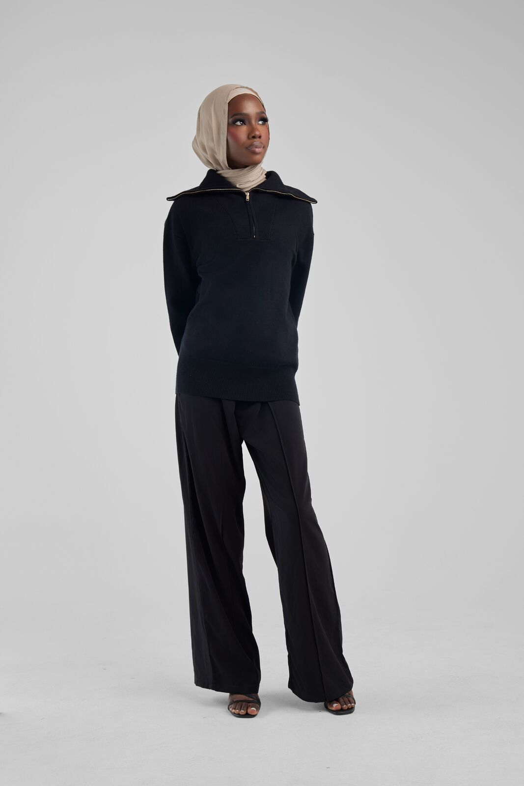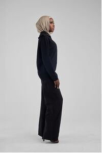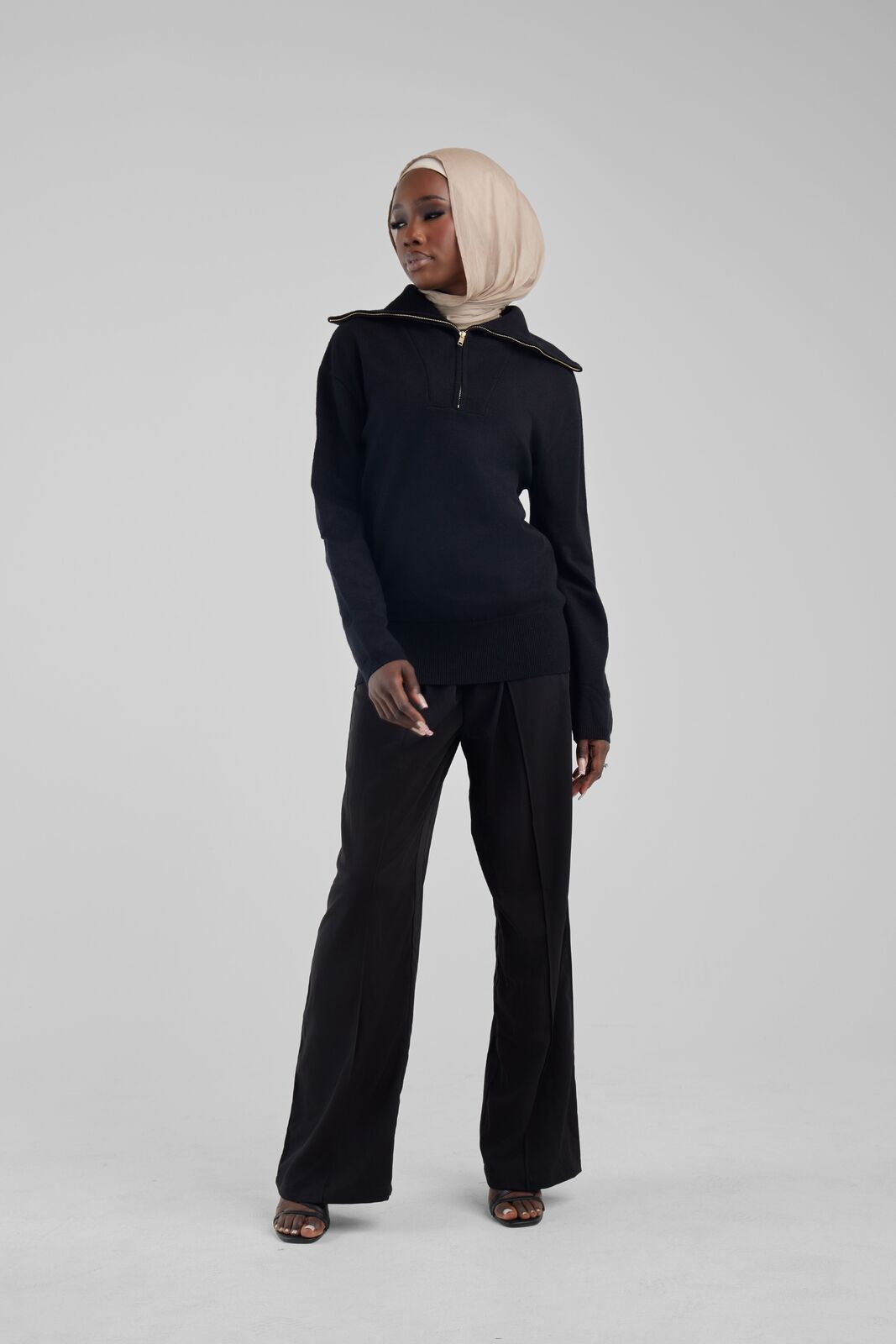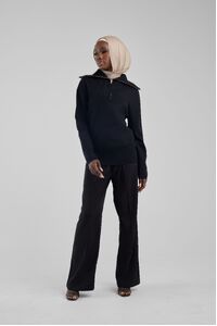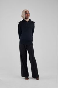Elevate your winter wardrobe with the Black Basic Zip Top, an embodiment of chic comfort. Expertly crafted in a sumptuous soft knit, this pullover boasts a boxy, cropped cut that exudes contemporary style. The oversized collar adorned with gold hardware adds a touch of luxury, while the dropped shoulders ensure a relaxed fit. This top is the quintessential layering piece for those seeking sophistication and warmth, pairing flawlessly with skirts for an effortlessly chic look. Make it your go-to for both casual outings and stylish evenings.