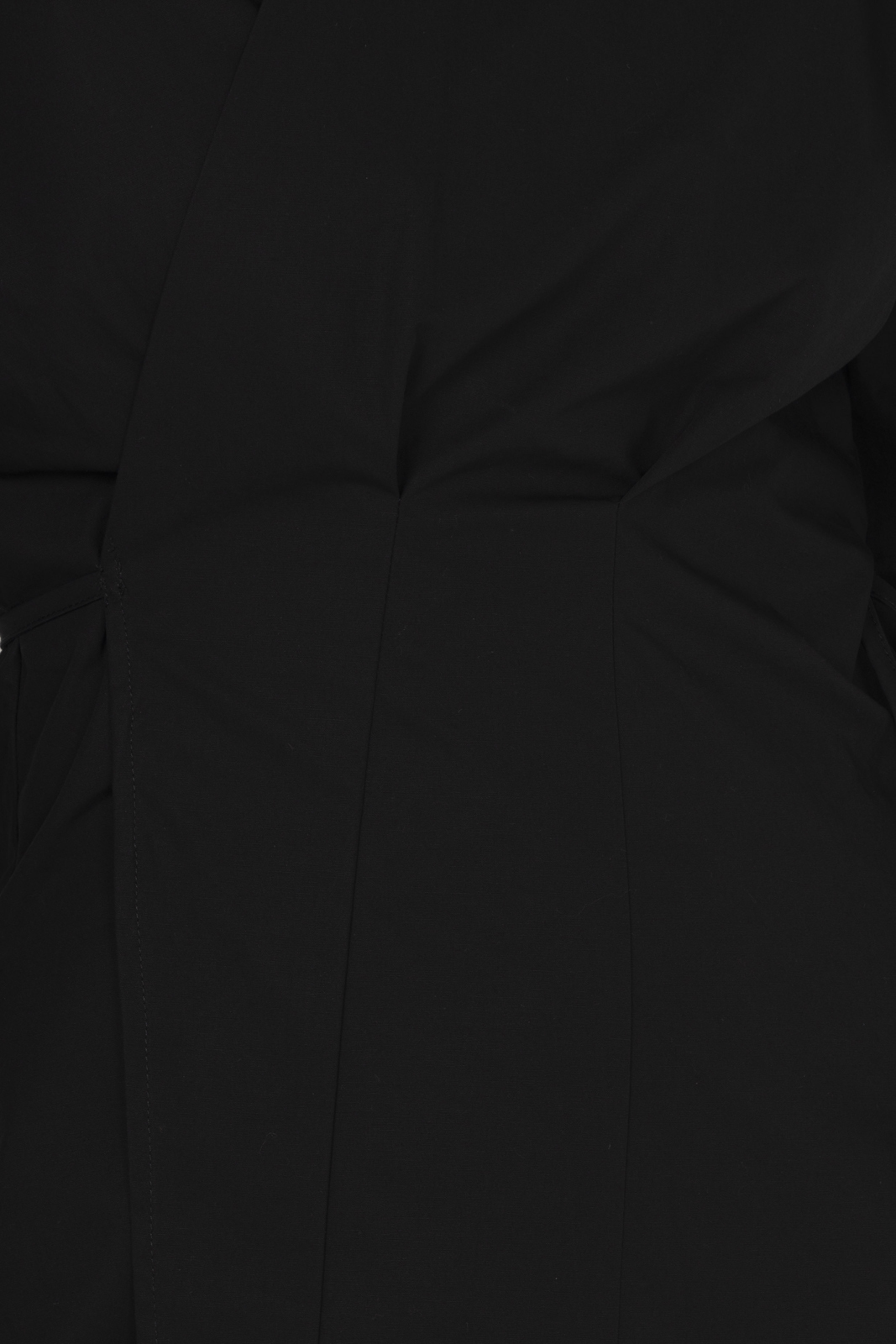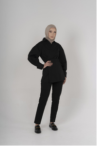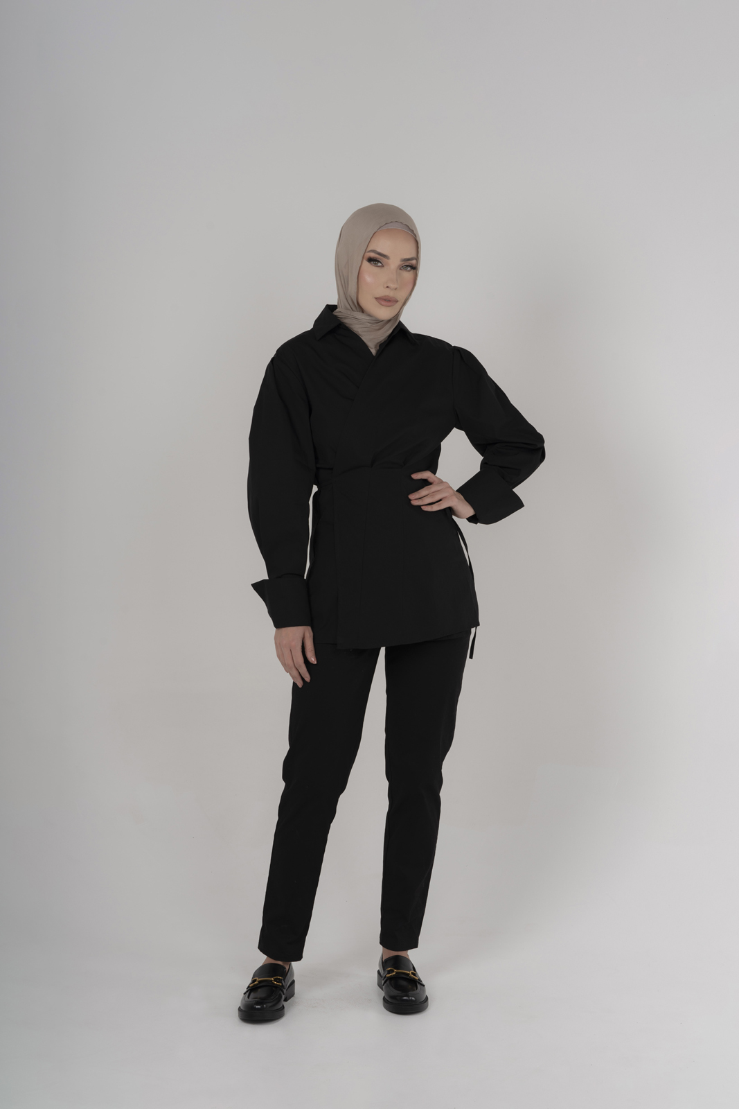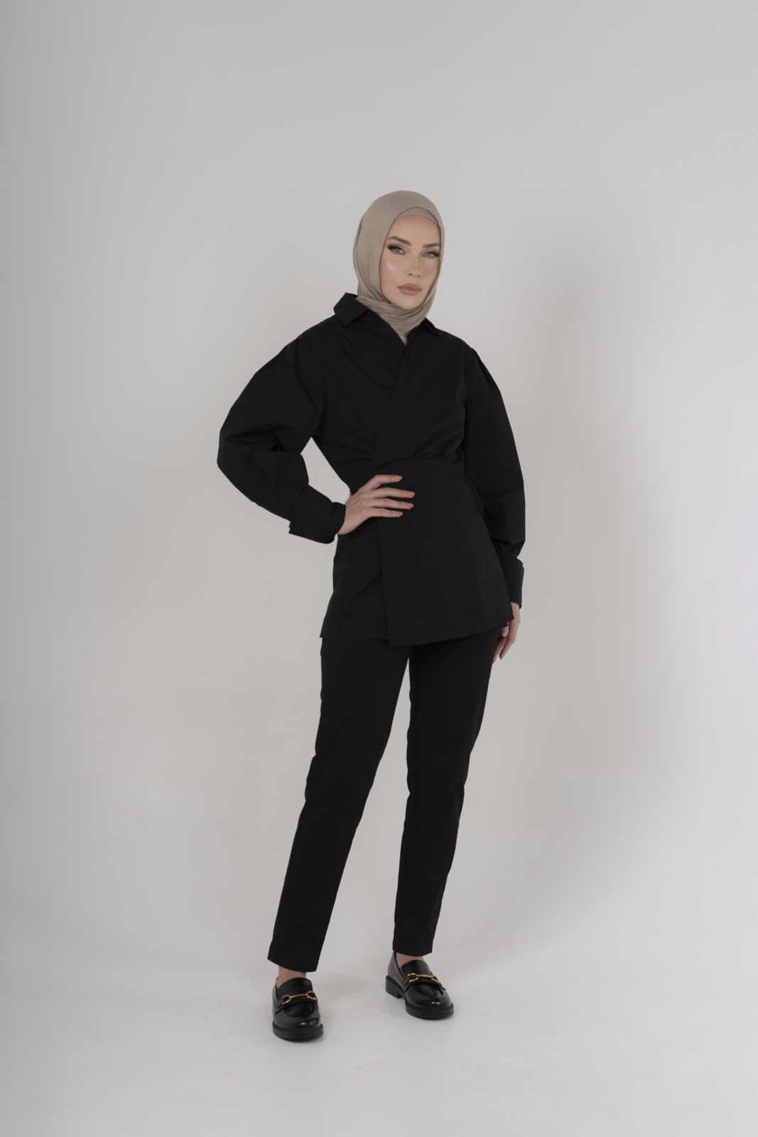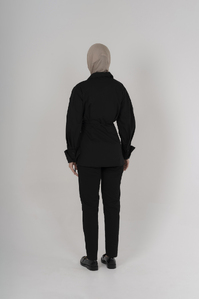 Add to your wardrobe, the new Black Collar Shirt. Designed to flatter, this shirt features an adjustable wrap style that contours to your unique silhouette, offering a personalized fit. The feminine balloon sleeves add a touch of elegance, featuring a double wrap cuff. Crafted with precision, the crisp collar adds a sharp accent to this versatile piece, perfect for both office attire and evening wear. Experience the seamless blend of comfort and style, making this black collar shirt an essential addition to your fashion repertoire.