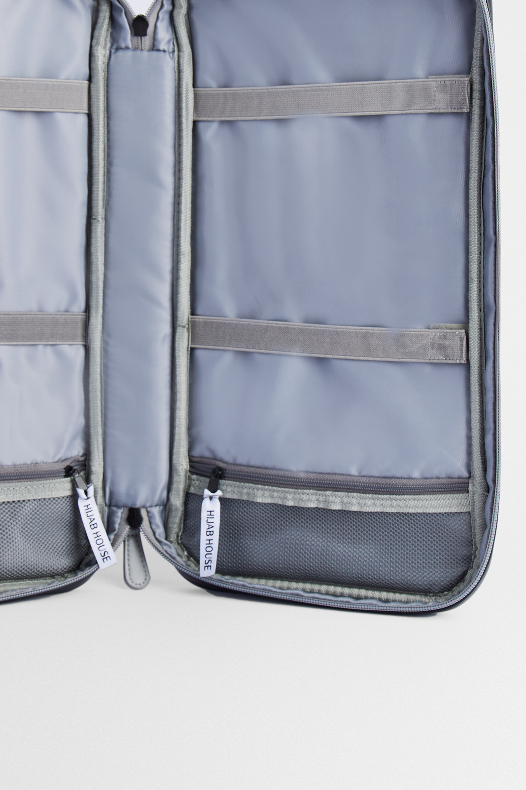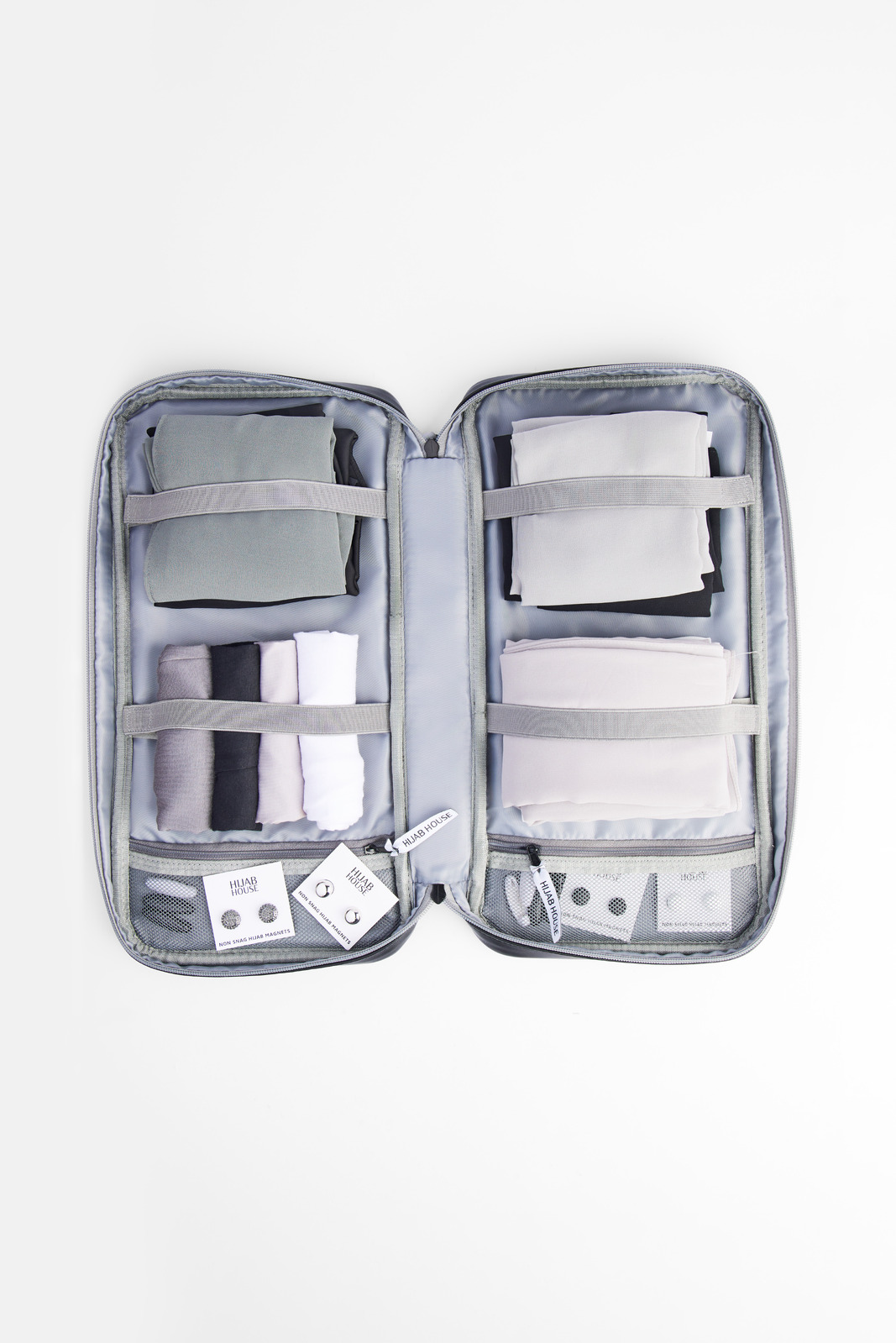 The Hijab Hub features a spacious main compartment, providing ample room to store a variety of hijabs. The bag's interior is thoughtfully designed with organizational features, including four stretchy bands strategically placed to secure your hijabs in place. Say goodbye to tangled scarves and hello to hassle-free travels, as these bands keep your hijabs neatly folded and prevent them from shifting during transit. The Hijab Hub includes two small compartments dedicated to storing your hijab pins. Designed with travel in mind, the Hijab Hub is lightweight and compact, making it the perfect companion for your adventures.