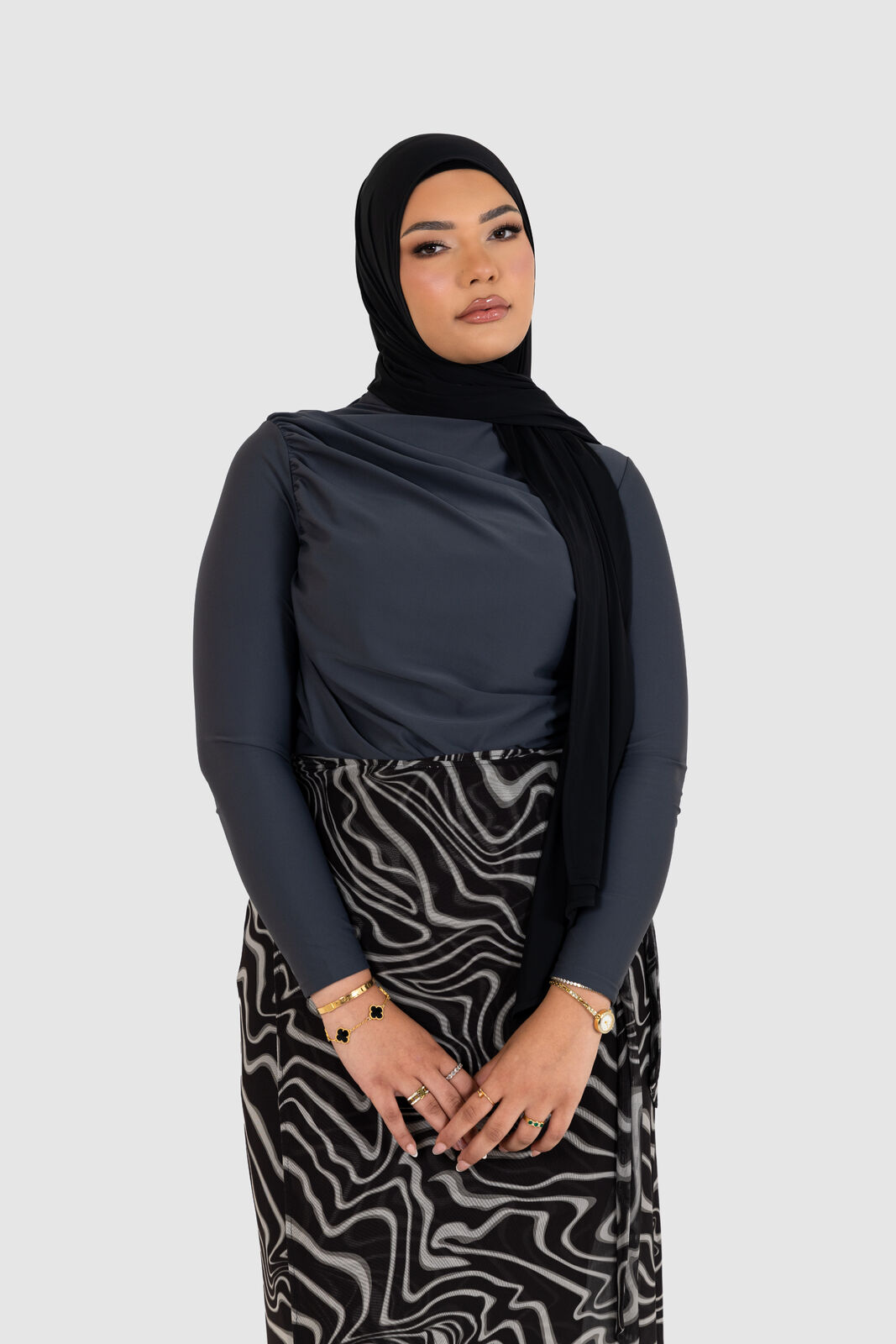 Prepare for a fantastic summer with the Monochrome Mesh Sarong, a stylish cover-up for your swimwear needs. Perfect for adding an extra layer, this sarong is designed for easy pairing with your swimsuit. Made from sustainable stretch mesh fabric, it features ties at the high-rise waist and drapes elegantly with an asymmetric hem.