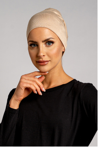 Essentials Cap made in blush coloured stretch-knit Japanese cotton. Tube cap style. Open from back. Measurements: width 22cm length 25cm.