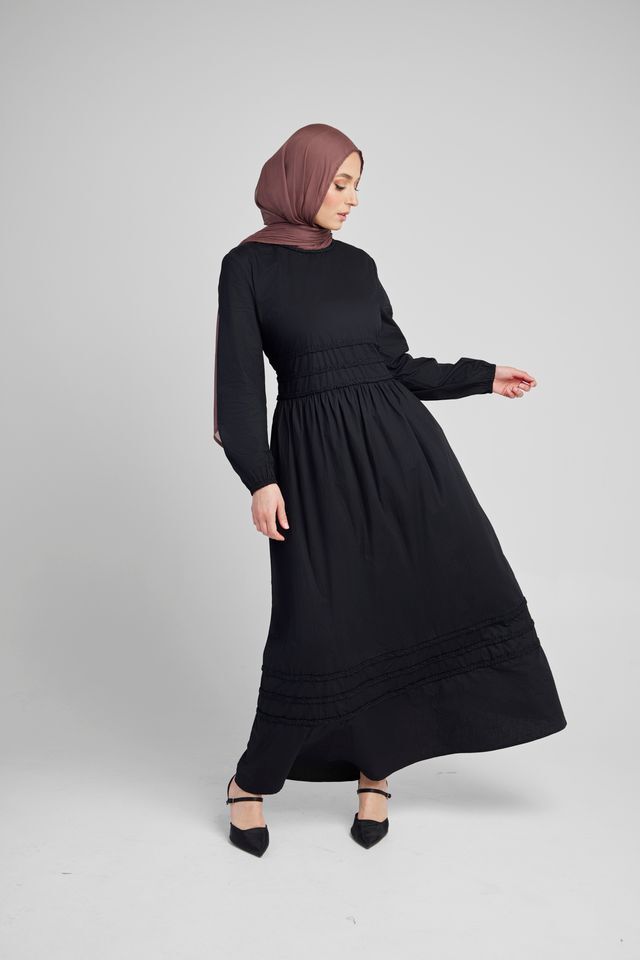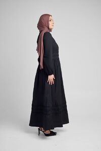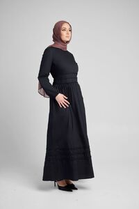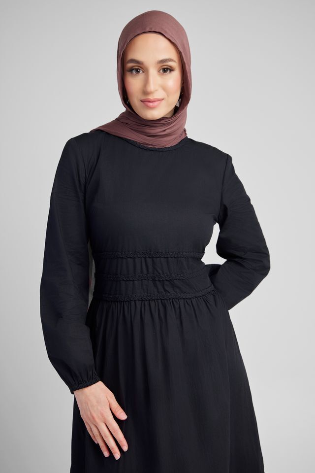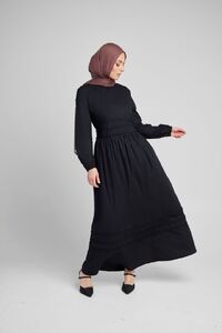 Enhance your wardrobe with the Braided Long Dress, symbolizing elegance and style. Crafted with a cotton finish, this maxi-length black dress features braided details that elevate its timeless look. The blouson sleeves with elastic cuffs offer a blend of comfort and