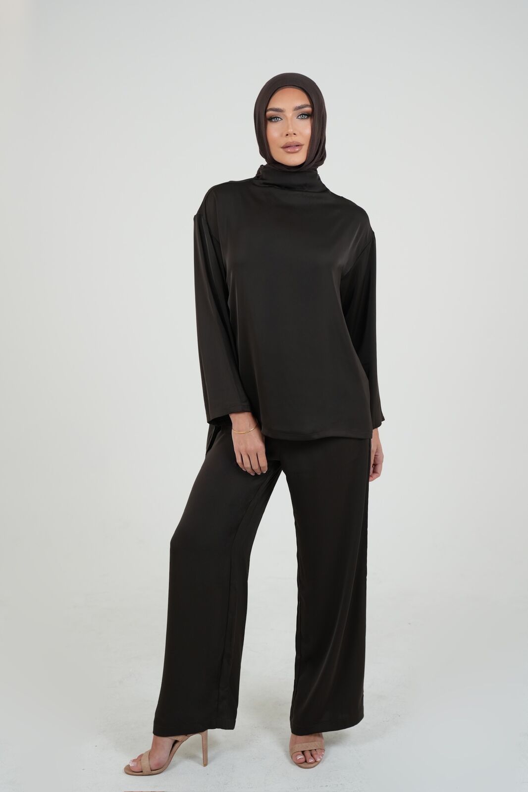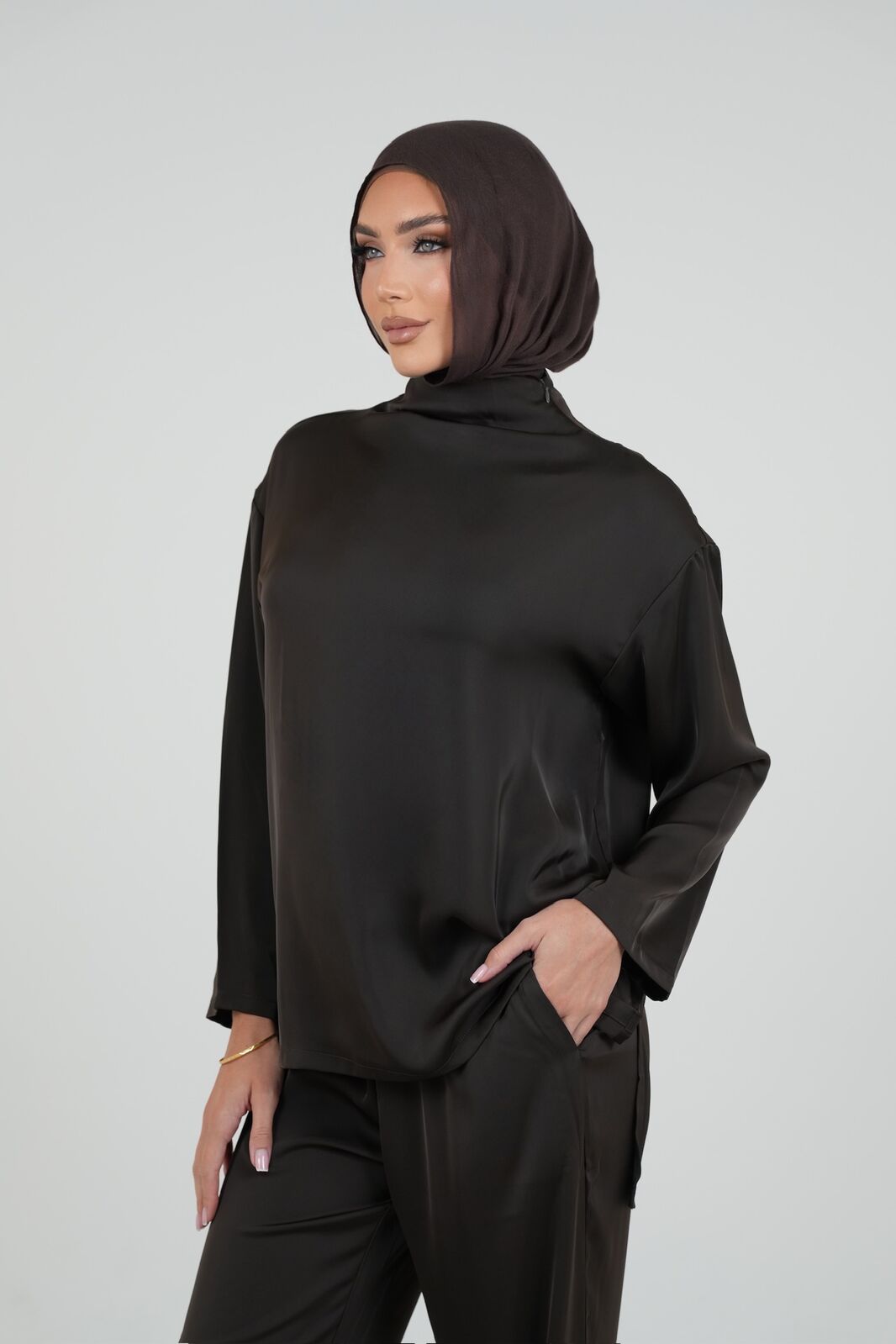 Meet your new favorite blouse—the Chocolate Satin Blouse. With its silky smooth feel and effortless slip-on design, this piece is all about looking chic with minimal effort. The high neckline adds a touch of elegance, while the rich chocolate color makes it a dream to style. Pair it with our matching chocolate trousers for the ultimate sleek look.