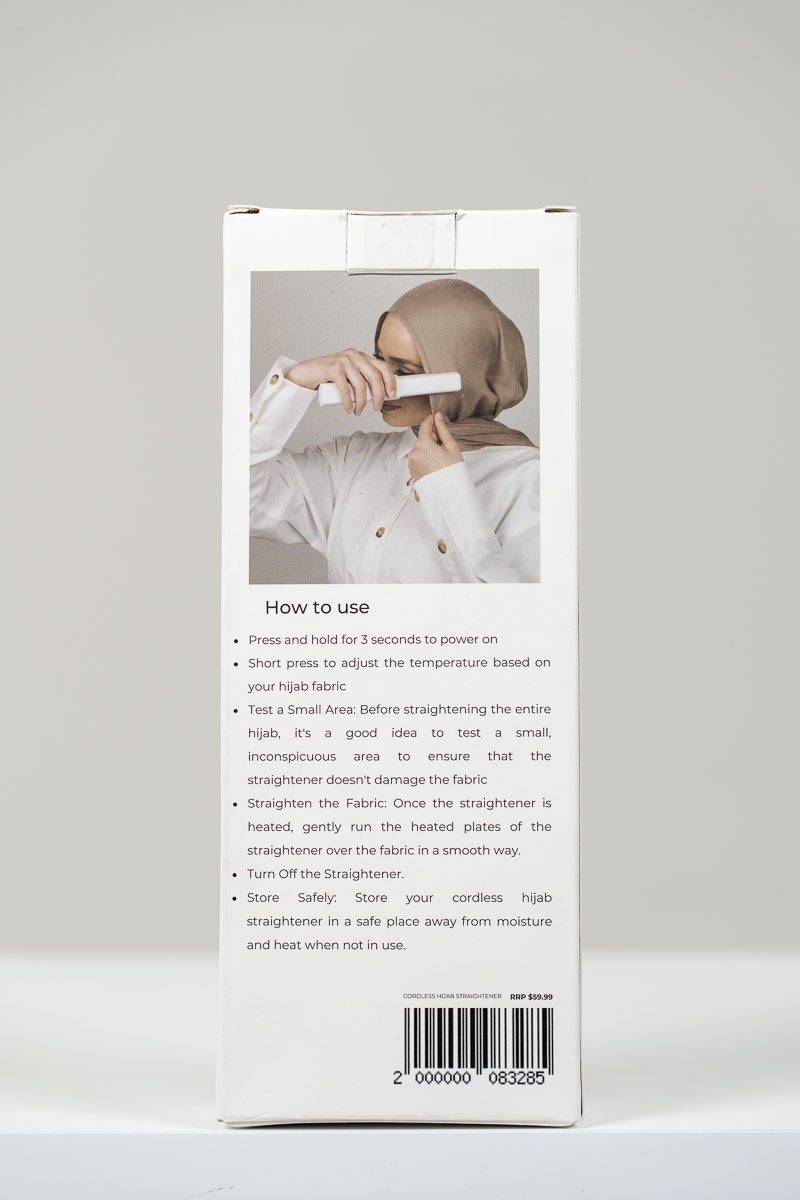 Achieve a perfectly smooth and flat hijab look effortlessly with our innovative cordless hijab straightener. Ideal for busy hijabis who appreciate style and convenience. Here's what you can expect: Enjoy the freedom of styling your hijab effortlessly with our cordless straightener, perfect for work, events, or travel. The straightener's advanced heating technology and user-friendly design provide precise control for a sleek look without harming your hijab fabric.
