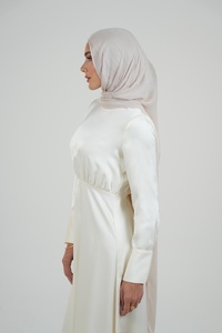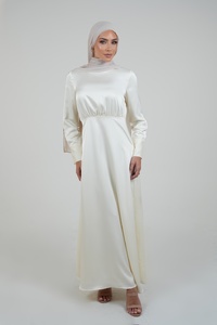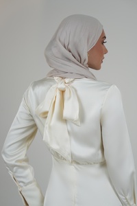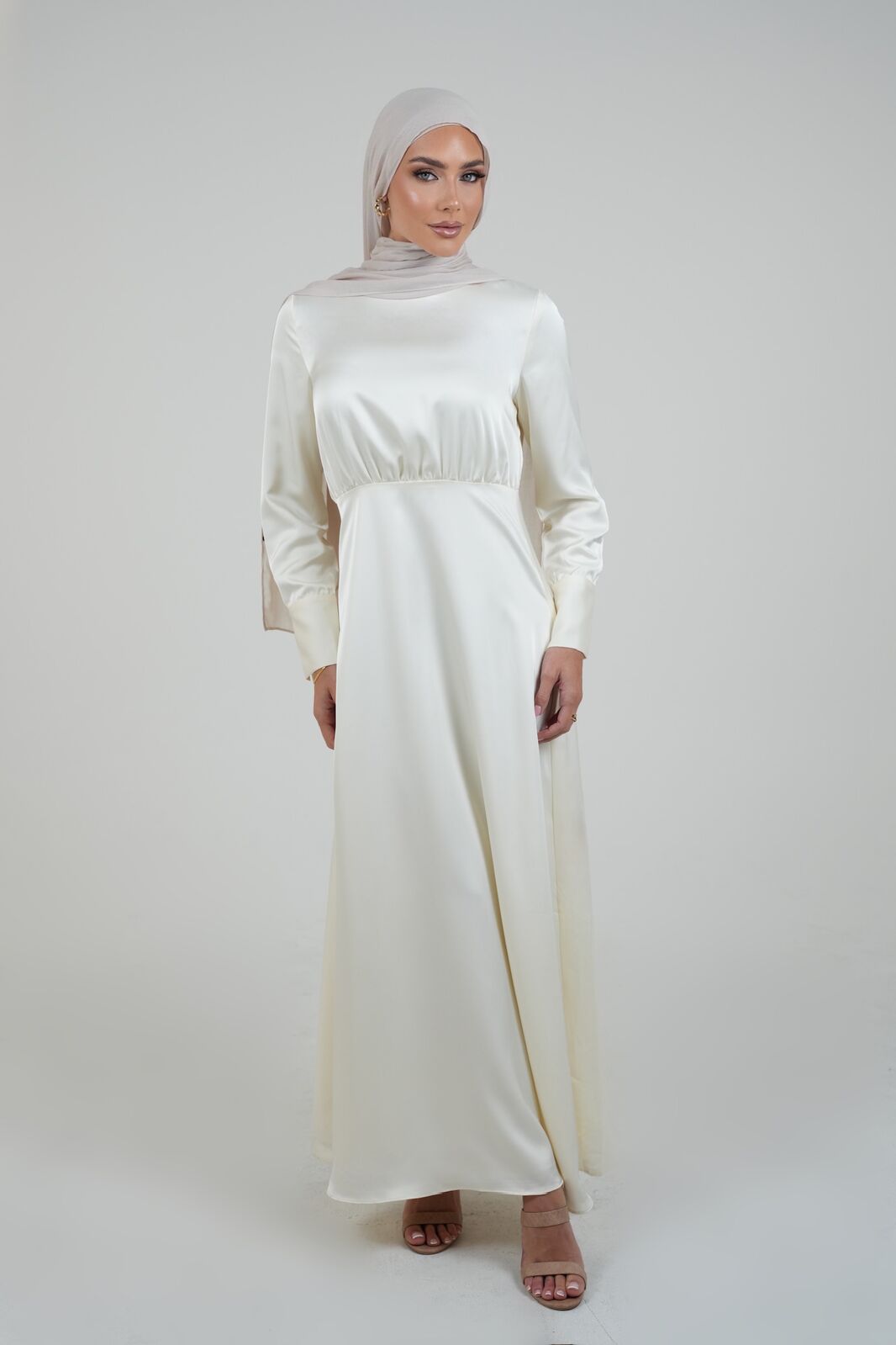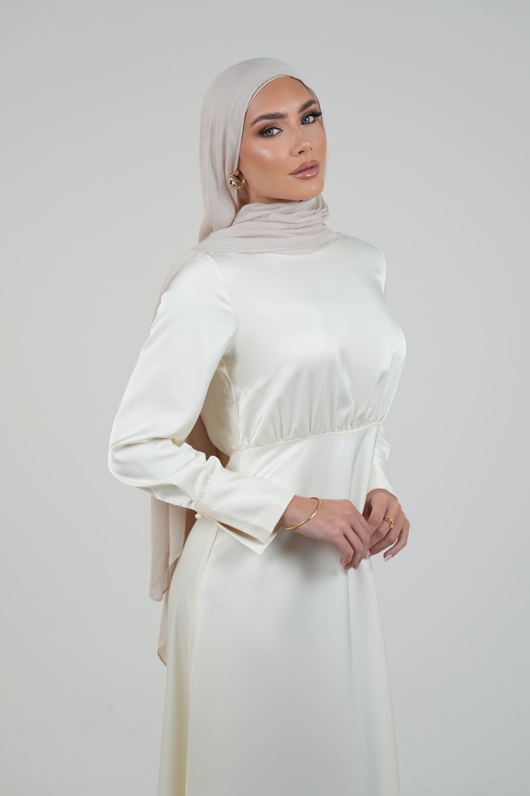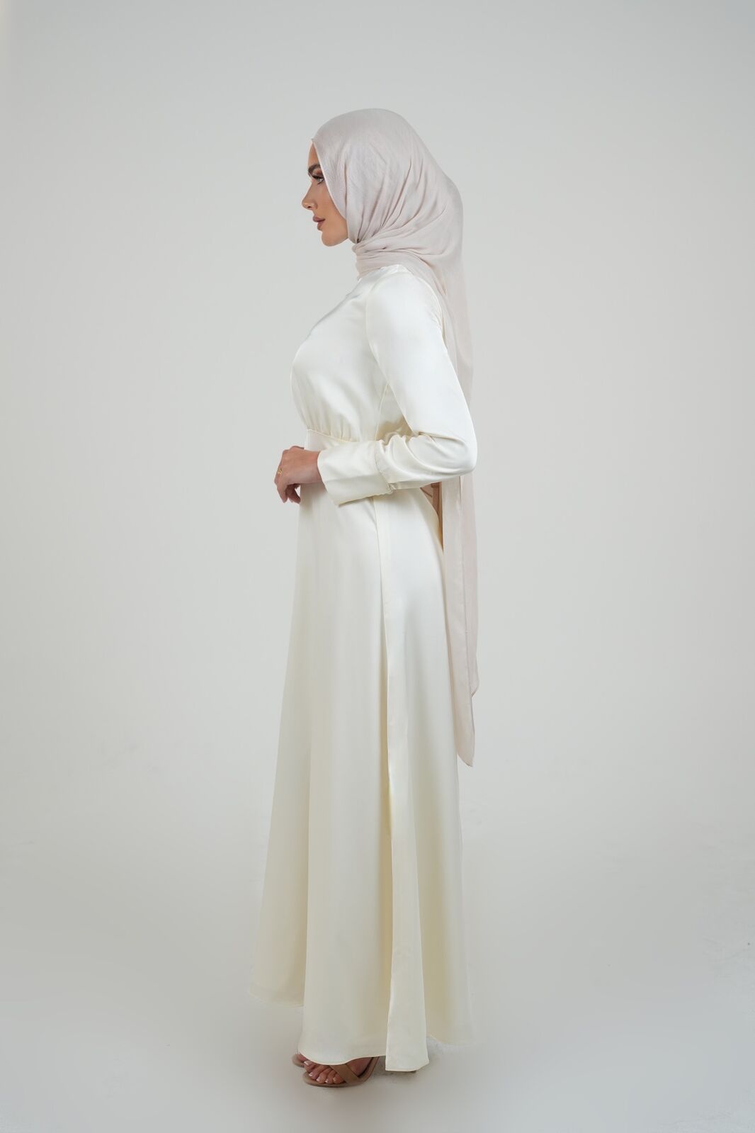 Soft, graceful, and effortlessly refined. The Cream Silk Gown is made from silky, non-sheer fabric that flows beautifully with every step. A delicate bow ties at the back of the neck, adding a feminine touch to this modest, full-length silhouette. The soft cream tone gives it a timeless elegance—perfect for weddings, special occasions, or evening wear.