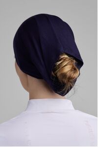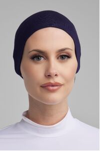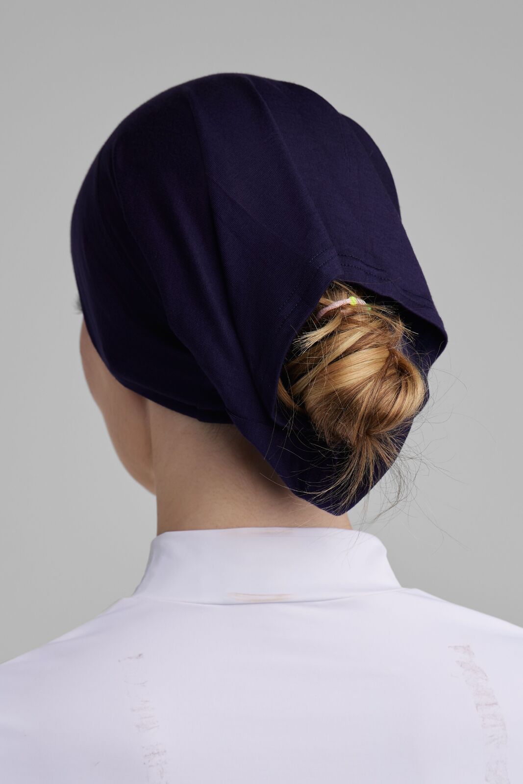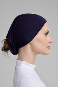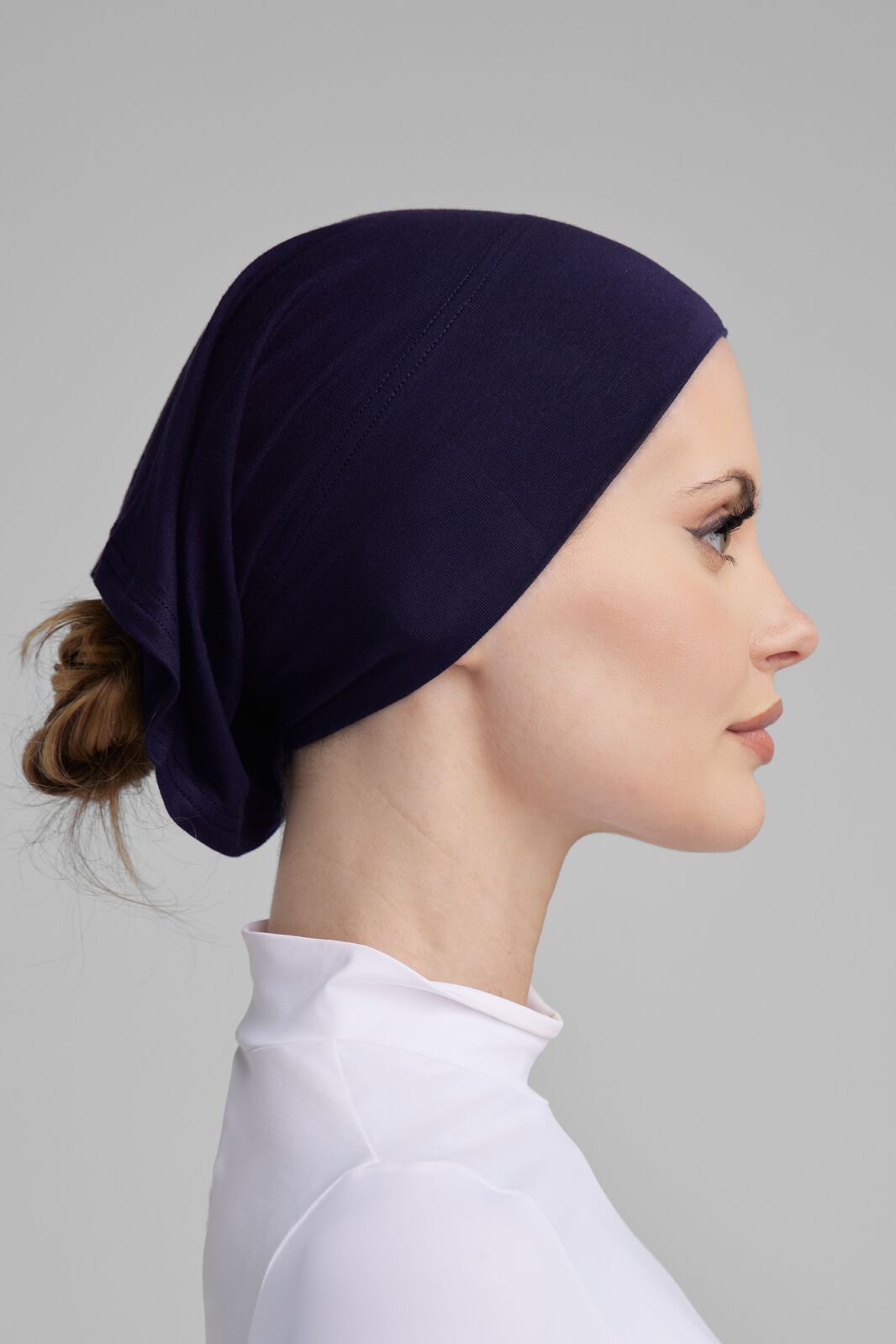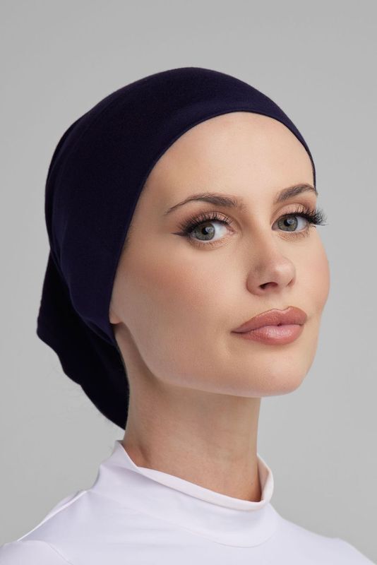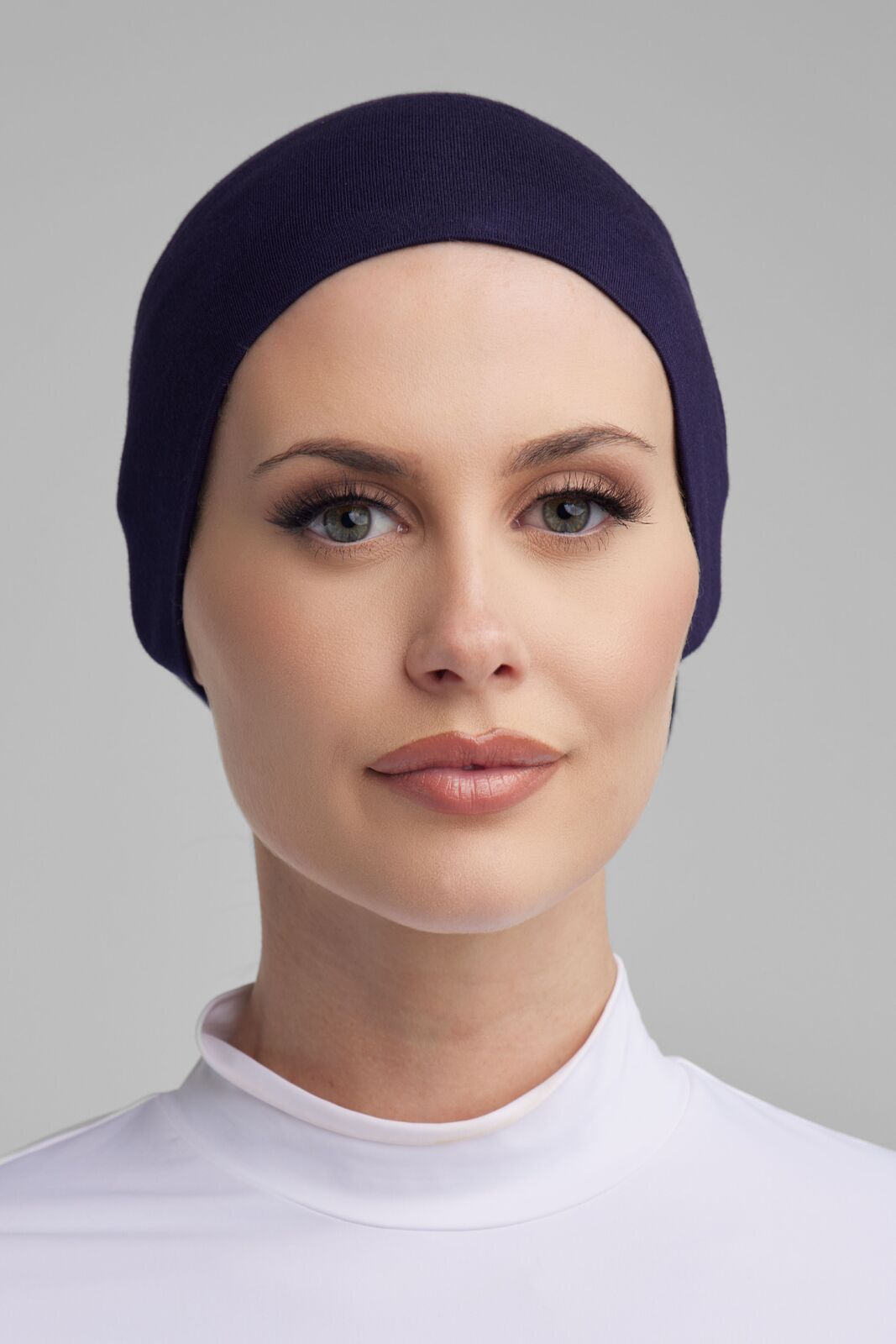 Essentials Cap made in Deep Navy coloured stretch-knit Japanese cotton. Tube cap style. Open from    back