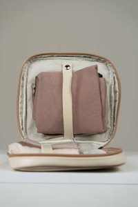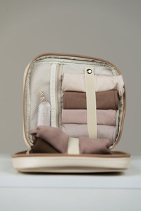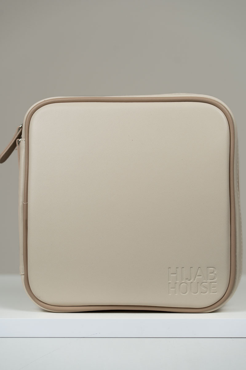 Introducing the Mini Hijab Hub, a compact version of the Hijab Hub. Offering ample space to store a variety of hijabs. Inside the bag, you'll find a well-thought-out design with organizational elements, such as two stretchy bands strategically positioned to secure your hijabs and caps neatly. No more dealing with tangled scarves – these bands ensure your hijabs remain neatly folded and in place while you're on the go. The Hijab Hub also features one small compartment specifically for storing your hijab pins. Tailored for travel, this lightweight and compact design makes the Hijab Hub the ideal companion for all your adventures.