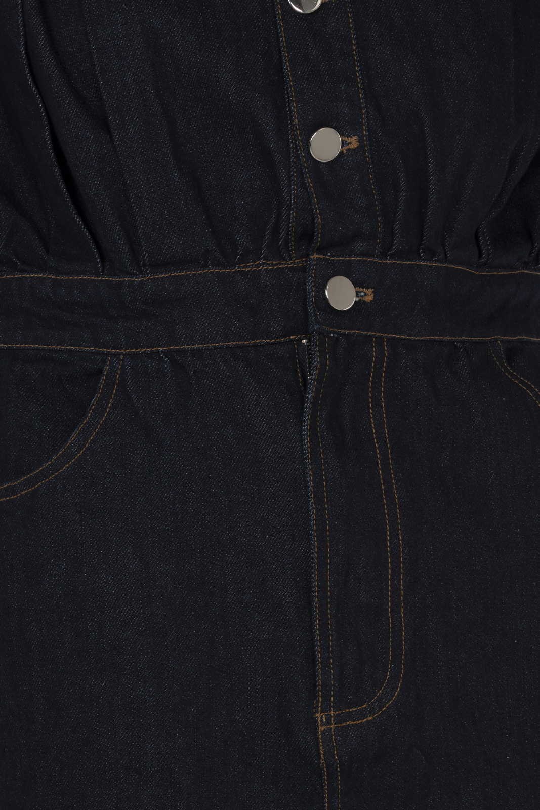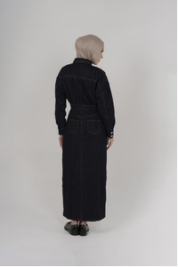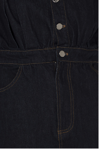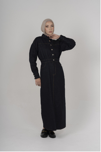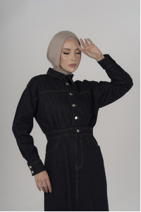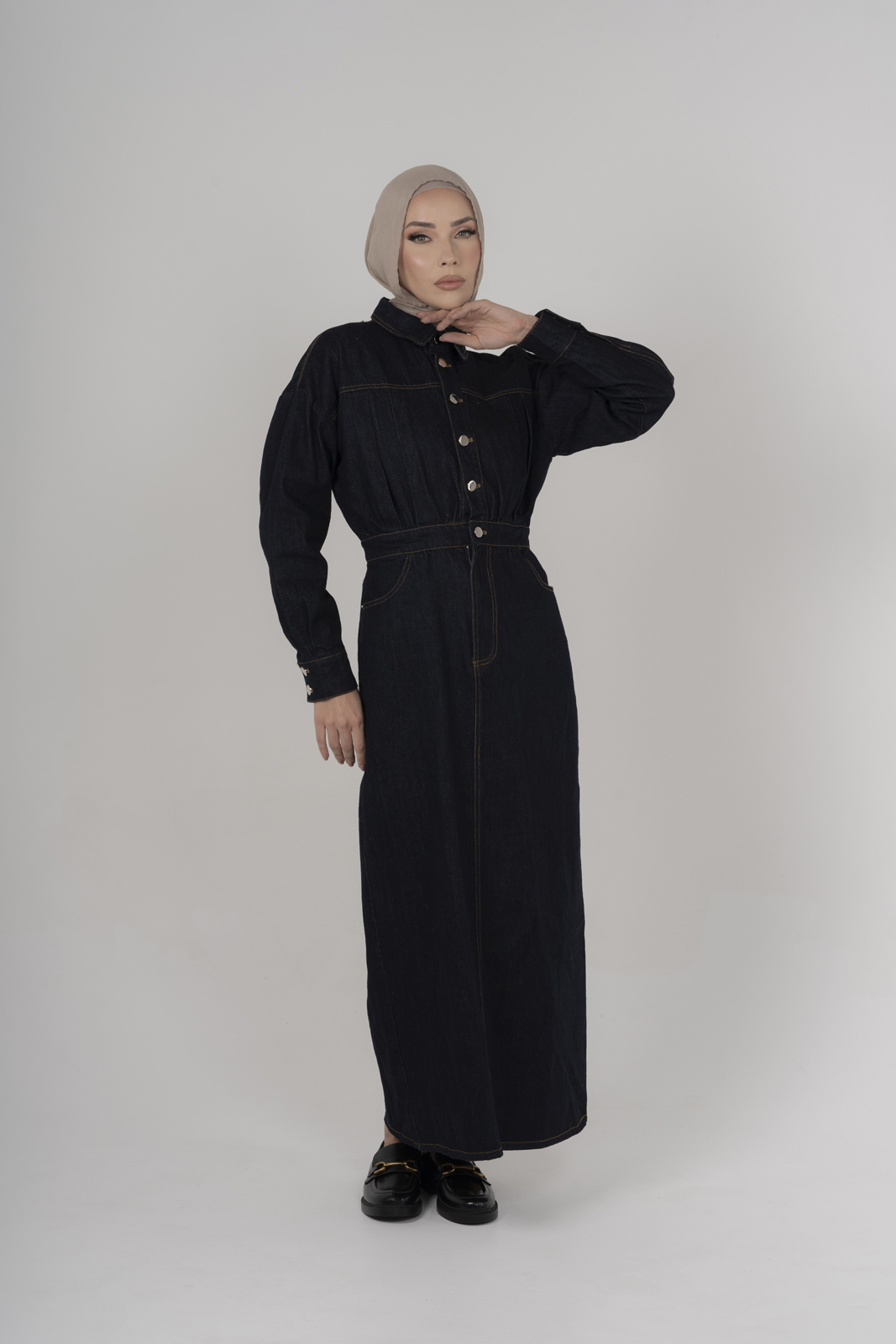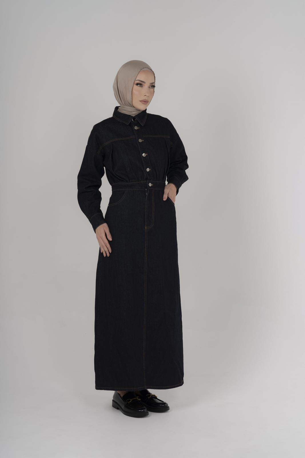 This Everyday Navy denim dress is the perfect go-to piece. Crafted from premium denim, this dress features a sleek button-down front complemented by a discreet zipper, ensuring a seamless silhouette that flatters every figure. With practical pockets and a sharp collar, the dress is accentuated by nude stitching that enhances its elegance. This dress is a exquisite piece for your everyday ensemble, it stands out in its versatility and style and is Perfect for transitioning from day to evening wear.