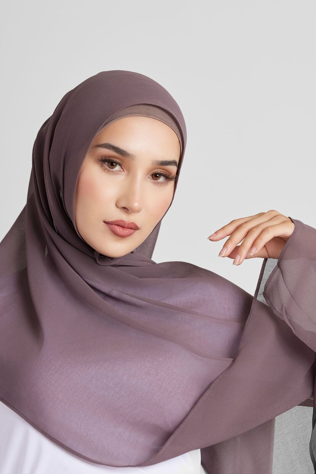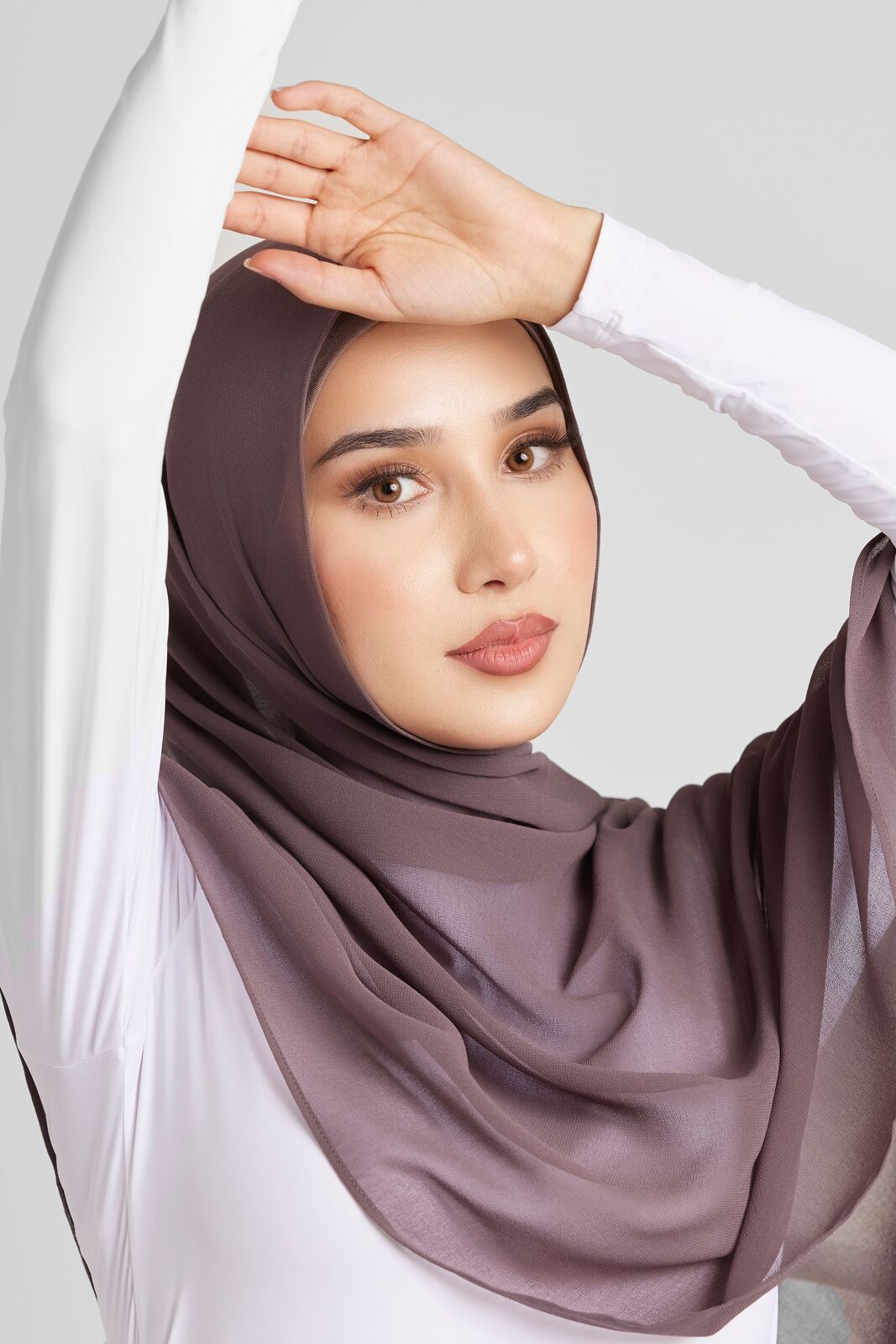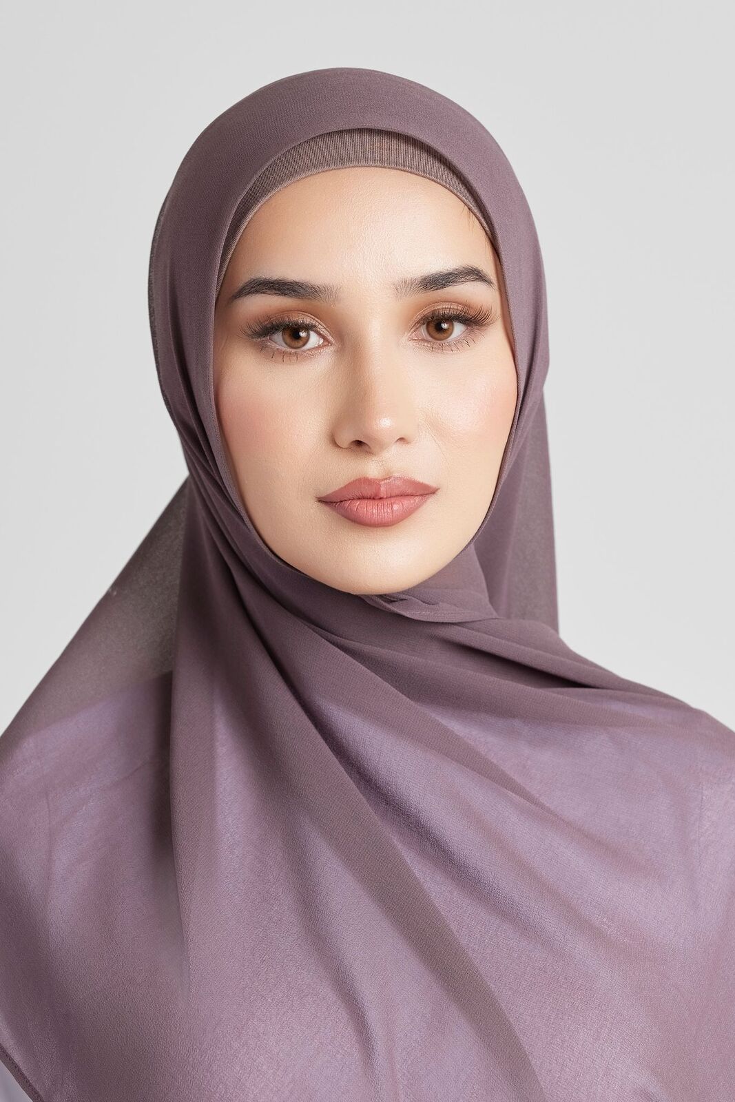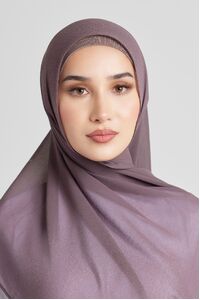 Soft polyester hijab in plain peppercorn colour. Non-slip fabric. Double-rolled hem.